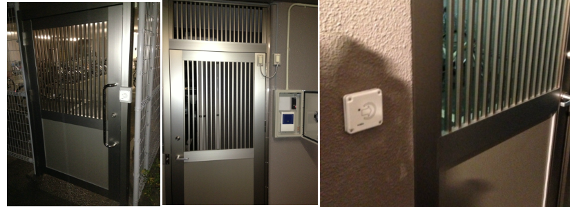 マンション駐輪場2ゲートに電気錠システムを取付(平成24年12月) 現場 福岡市内 商品 非接触カードリーダ レジックスター HC-7010 制御盤 TS-U501 電気錠 U9AL3M プログラム Bストラクチャー